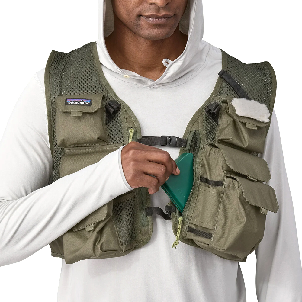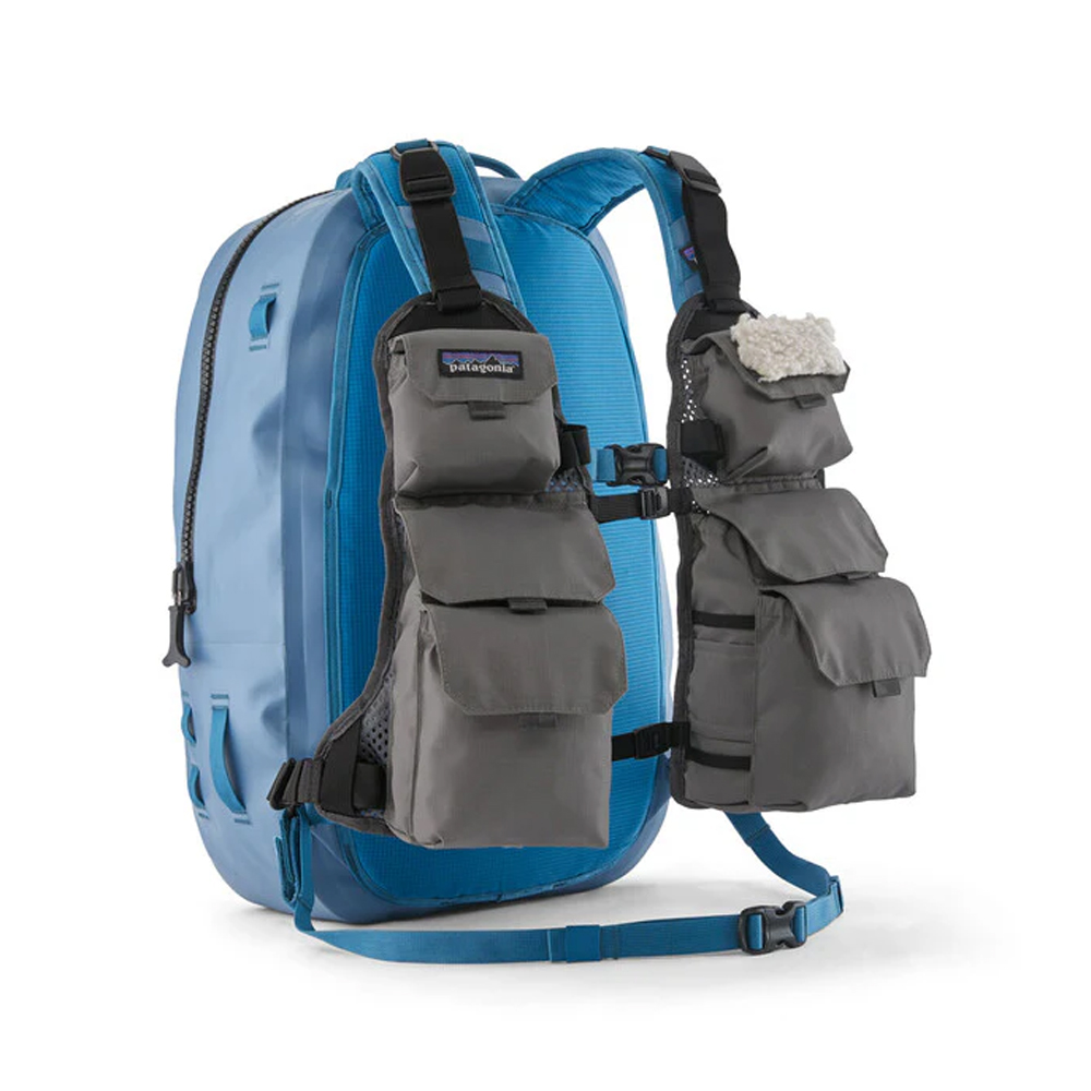 Gancho para caña, parche para moscas, puerto para pinza hemostática, múltiples puntos para clip y accesorios, talle ajustable para lograr el calce y transporte precisos
